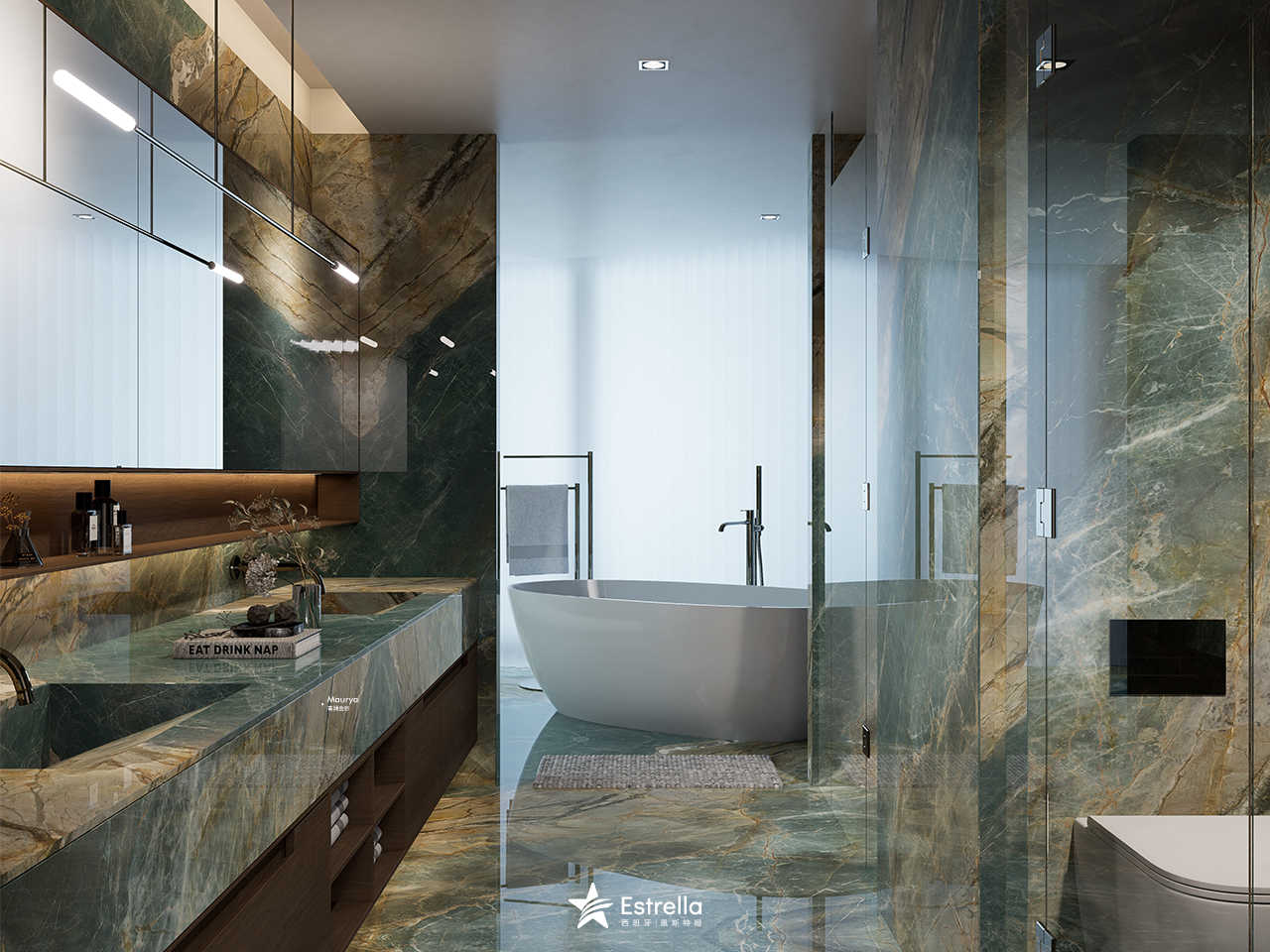 从工艺上看,Estrella恩斯特娅开拓性研发行业石刻面&真石面工艺,还采用了晶钻面抛光等工艺。以Maurya青澜金砂为例,其表面的晶钻面抛光工艺,在光线折射下呈现细腻的金砂质感与深浅交织的青色脉络,为空间注入低调的奢华与动态光影层次。